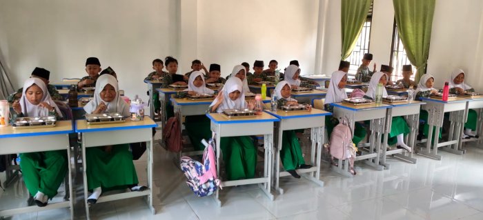 Siswa-siswi terlihat antusias dan tertib saat menikmati makanan yang disajikan di dalam kelas. Dengan adanya program ini, diharapkan dapat meningkatkan daya tahan tubuh siswa, mencegah stunting, serta meningkatkan semangat dan prestasi belajar di lingkungan madrasah.
